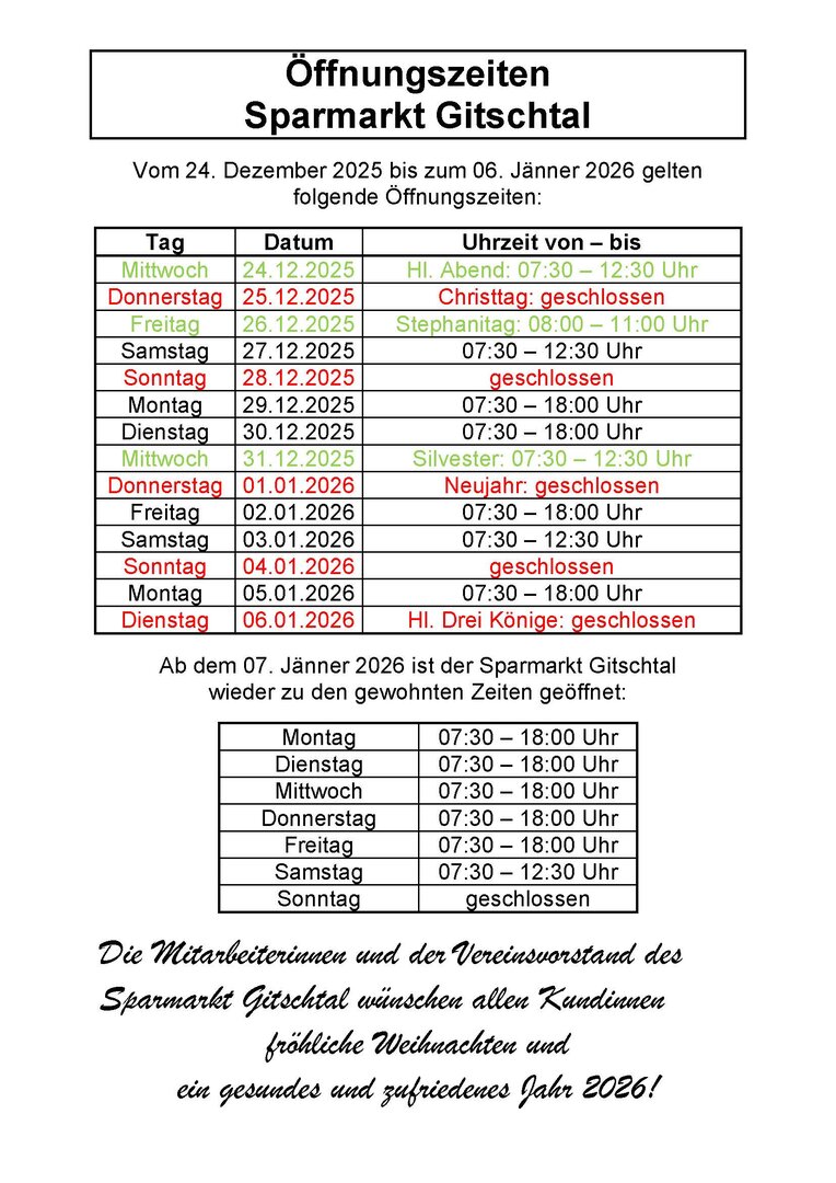 Weihnachtsöffnungszeiten Sparmarkt Gitschtal